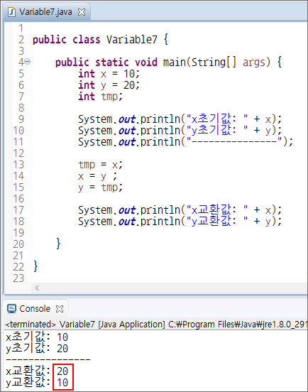 x 변수에 새로 저장된 20이 y 변수에 다시 저장된다.
