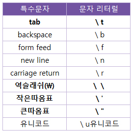 아래와 같이 char 또는 String 타입 변수에 특수문자도 저장이 가능하다.
