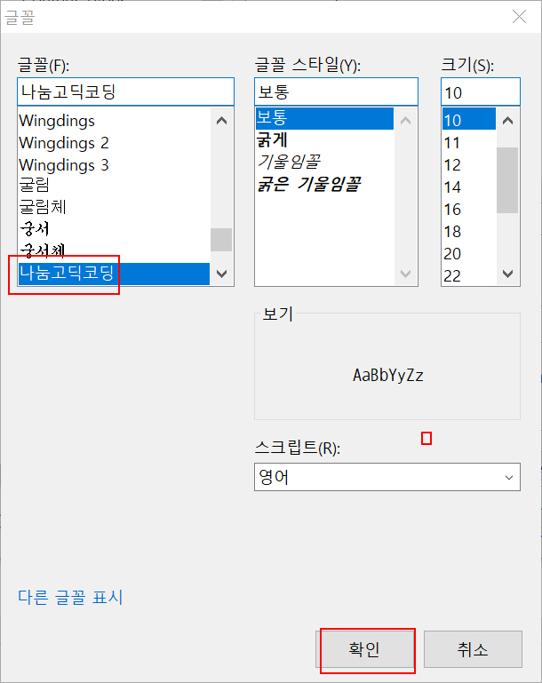 원하는 폰트 선택 후 확인 >